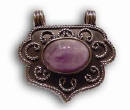 This is a sterling silver pendent containing an amethyst stone in the center, designed by Kamal and Amir Agha